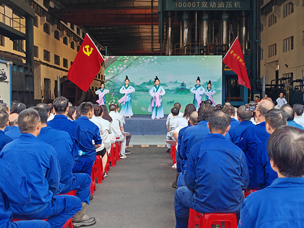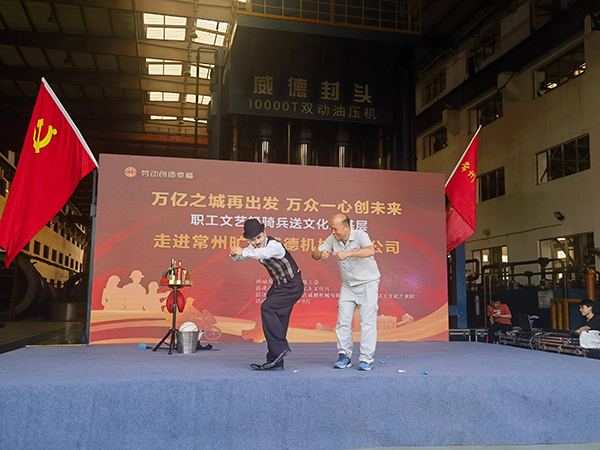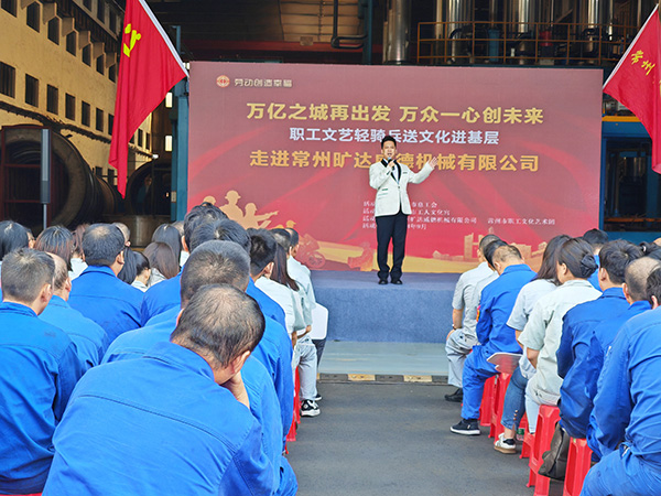 9月28日正值曠達威德十二周年慶典紀念日,市總工會“龍城職工大舞臺”職工文藝輕騎兵送文化到常州曠達威德機械有限公司。當天下午15:00,公司3號車間門口的場地上已經(jīng)熱鬧起來了,規(guī)劃整齊的桌椅、接電配裝的音響設備、搭建完成的舞臺等都在做最后的調試,演職人員也在為上臺表演整理自己的妝造。員工們在現(xiàn)場工作人員的引領下整齊有序地入座。