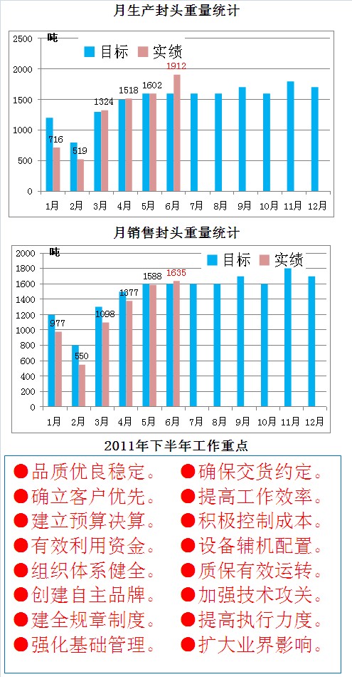 7月6日,王健總經(jīng)理如期向公司全體員工作WD·2011年中期報告。 王總跟往常一樣,首先帶領(lǐng)大家重溫了公司綱領(lǐng):自主創(chuàng)新、振興產(chǎn)業(yè),貢獻國家、回饋社會。他總是想讓每一位威諾德人牢記公司崇高的使命,恪守既定的價值觀。緊接著,他又反復(fù)強調(diào)了公司的經(jīng)營方針:價格合理、品質(zhì)優(yōu)異,交貨及時、客戶滿意。他力圖讓每一位威諾德人明白,這四點經(jīng)營方針,任何一點都必須堅守,這是市場競爭的四大制勝法寶。 其次,王總通報了半年度經(jīng)營業(yè)績:生產(chǎn)封頭7600噸,完成銷售2.4億元,其中不銹鋼封頭比例為69.23%,生產(chǎn)封頭個數(shù)34975個,半年度計劃總達成率為101.85%。他對2011年上半年公司的經(jīng)營情況作了中期匯總,并歸結(jié)為:隆重舉行開業(yè)慶典,行業(yè)地位明顯提升,品牌效益日益突顯,設(shè)備輔機不斷配置(2200噸壓鼓整機、3000噸壓機輔機、FM4冷旋壓機先后投入使用,沖壓、旋壓模具基本完成,打磨機、手動拋光機按計劃增加,FM4.5熱旋壓機在制),生產(chǎn)經(jīng)營初具規(guī)模,組織體系得以建立,規(guī)章制度不斷完善,質(zhì)保體系運轉(zhuǎn)良好,行業(yè)用戶普遍認(rèn)可,遠(yuǎn)期發(fā)展正在籌備。 接下來,王總要求全體員工明確2011年下半年工作重點,并將其歸納為:確保品質(zhì)優(yōu)良穩(wěn)定,確保交貨約定,確立客戶優(yōu)先,提高工作效率,建立預(yù)算決算,積極控制成本,有效利用資金,繼續(xù)配置設(shè)備輔機,不斷健全組織體系,確保質(zhì)保有效運轉(zhuǎn),加快創(chuàng)建自主品牌,大力加強技術(shù)攻關(guān),加快建全規(guī)章制度,大力提高執(zhí)行力度,日益強化基礎(chǔ)管理,不斷擴大業(yè)界影響。 公司下半年的主要計劃指標(biāo)是:每月生產(chǎn)封頭平均1500噸,到年底完成總銷售金額4.5億元。 其它分列計劃指標(biāo)是:交貨合格率≥99.985%,不銹鋼比例≥50 %,焊接一次合格率≥98%,生產(chǎn)天數(shù)≤5天,生產(chǎn)延期率≤3%。 王總在大會上還概括了公司的優(yōu)勢:設(shè)備品種齊全、優(yōu)勢明顯,員工戰(zhàn)斗力強、團隊協(xié)作好、技術(shù)能力強、生產(chǎn)效率高、銷售能力強、企業(yè)口碑好。同時,王總語重心長地說,在大力發(fā)揚現(xiàn)有優(yōu)勢的同時,還要清醒地認(rèn)識到在激烈的市場競爭下,公司必須在穩(wěn)定產(chǎn)品質(zhì)量、確保按時交貨方面進一步努力,在加強部門溝通、保證人員穩(wěn)定和打造企業(yè)文化方面進一步作為。 最后,王總組織全體員工再次學(xué)習(xí)了公司的質(zhì)量方針、品質(zhì)目標(biāo)、員工精神、企業(yè)愿景、銷售方針、安全方針和生產(chǎn)方針。