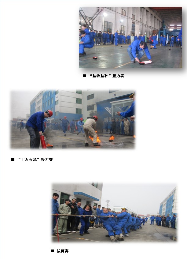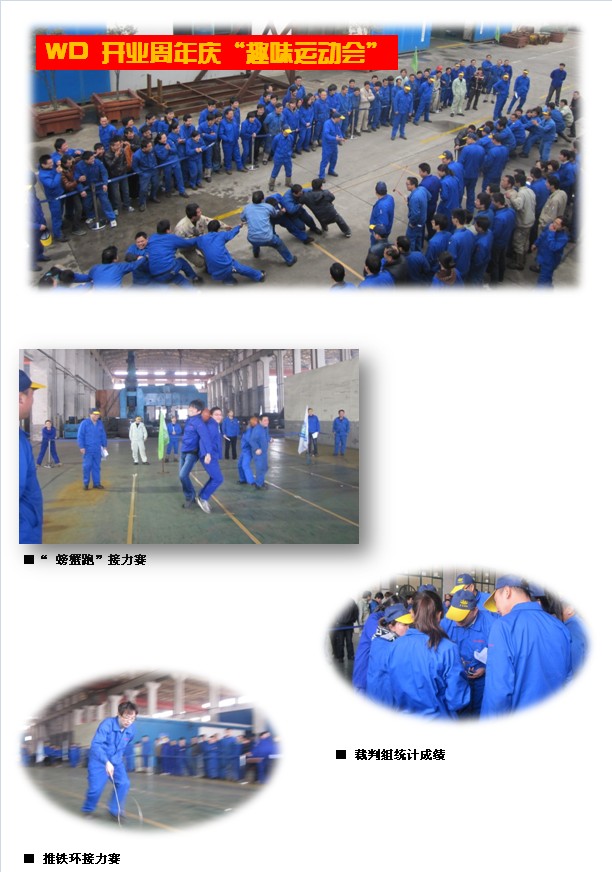 本屆趣味運(yùn)動(dòng)會共進(jìn)行5項(xiàng)比賽:“螃蟹跑”接力賽、“搶種搶收”接力賽、“推鐵環(huán)”接力賽、“十萬火急”接力賽、拔河比賽,共為全體員工提供了376個(gè)參賽資格,基本實(shí)現(xiàn)了人人都可報(bào)名參加。舉辦廠慶運(yùn)動(dòng)會的通知貼出去以后,許多員工都到各自領(lǐng)隊(duì)那兒踴躍報(bào)名,他們被劃分為8個(gè)代表隊(duì):焊接科代表隊(duì)、成形科代表隊(duì)、后序科代表隊(duì)、切割中心代表隊(duì)、管理、經(jīng)營、總經(jīng)辦、供應(yīng)部聯(lián)隊(duì)、技術(shù)、總務(wù)、財(cái)務(wù)部聯(lián)隊(duì)、質(zhì)保部代表隊(duì)、銷售公司代表隊(duì)。另外為保證運(yùn)動(dòng)會的順利進(jìn)行,運(yùn)動(dòng)會組委會設(shè)立3名正、副主任委員、2名正、副裁判長、16名裁判、4名記錄員、2名調(diào)度員、2名播音員、2名安全監(jiān)督員、3名后勤及供應(yīng)保障人員、1名攝影人員、2名場地與器材準(zhǔn)備人員和1名醫(yī)療衛(wèi)生人員,總務(wù)部牽頭負(fù)責(zé)相關(guān)聯(lián)絡(luò)事宜。每項(xiàng)比賽都設(shè)立一、二、三等獎(jiǎng)。最后為獲得一、二、三等獎(jiǎng)的隊(duì)員發(fā)放了相應(yīng)的獎(jiǎng)品,并為沒有獲獎(jiǎng)的參賽人員發(fā)放了紀(jì)念品。